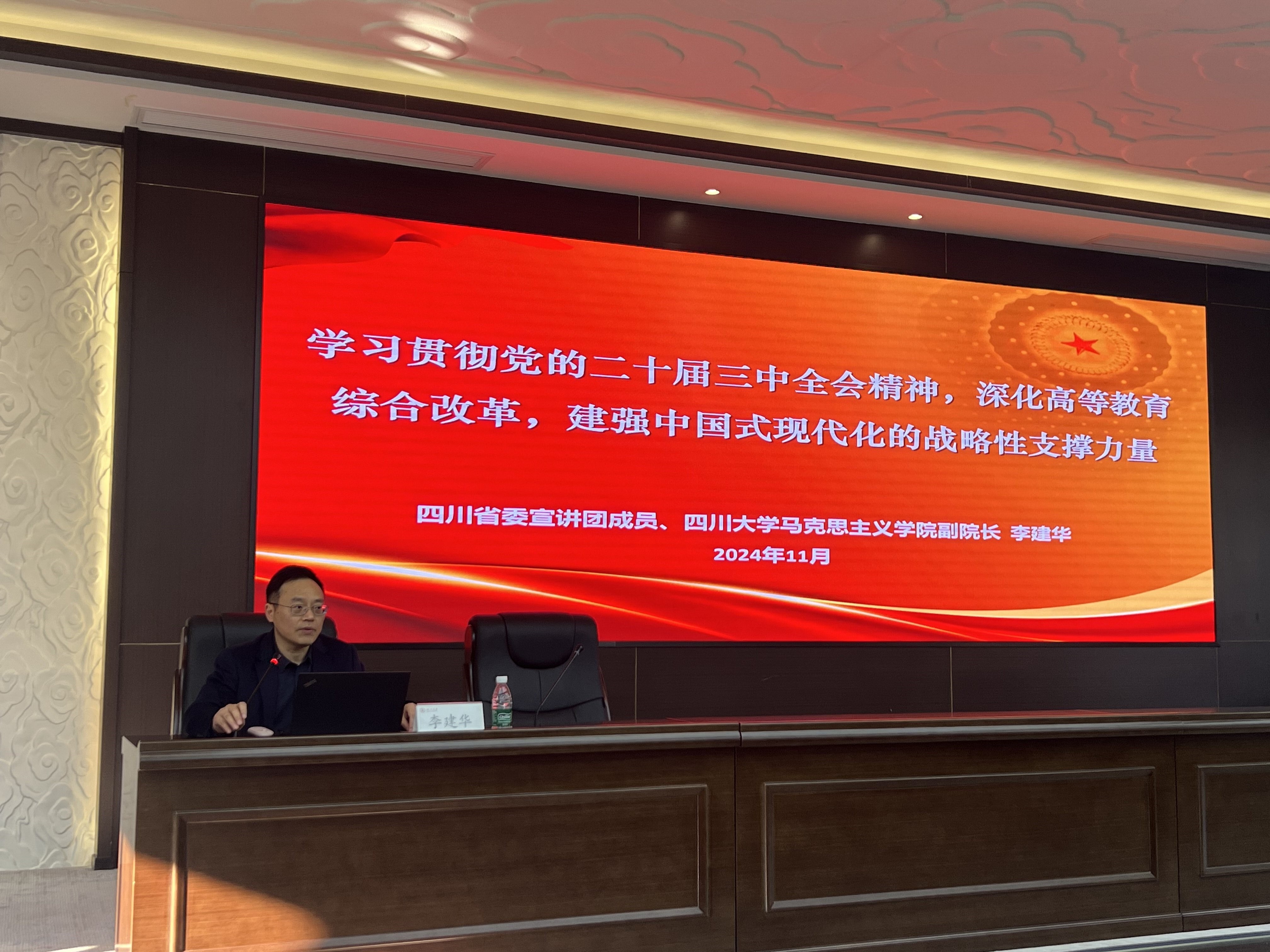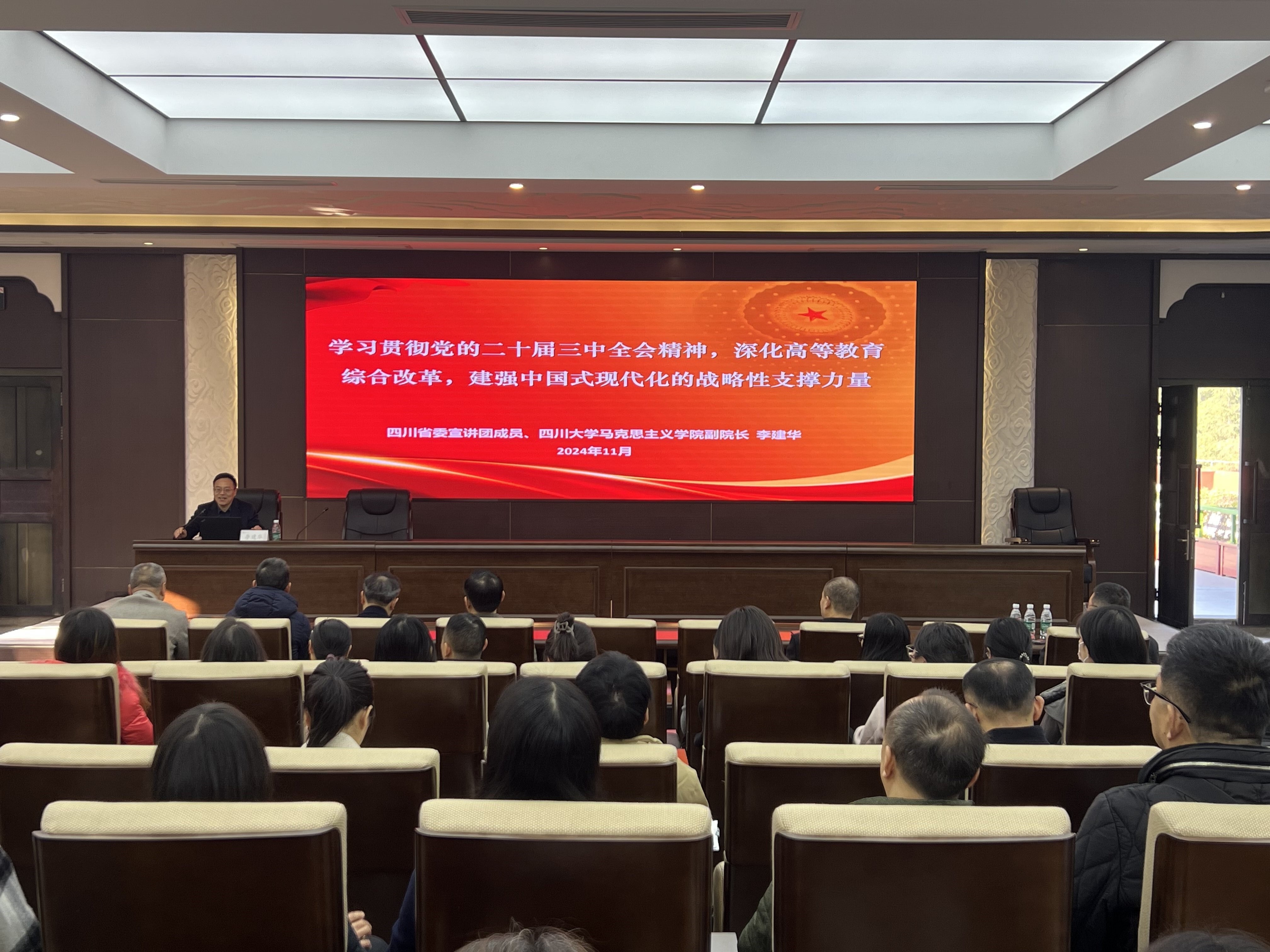 李建华副教授以“学习贯彻党的二十届三中全会精神,深化高等教育综合改革,建强中国式现代化的战略性支撑力量”为题,回顾了我国高等教育创造的举世瞩目发展成就,结合当前国际国内形势、新一轮科技革命和产业变革、人民群众新期待等“三个面对”,阐释了深刻领会和把握进一步全面深化改革的重大意义,重点解读了深化高等教育综合改革的紧迫性和推进高等教育综合改革的重大举措。