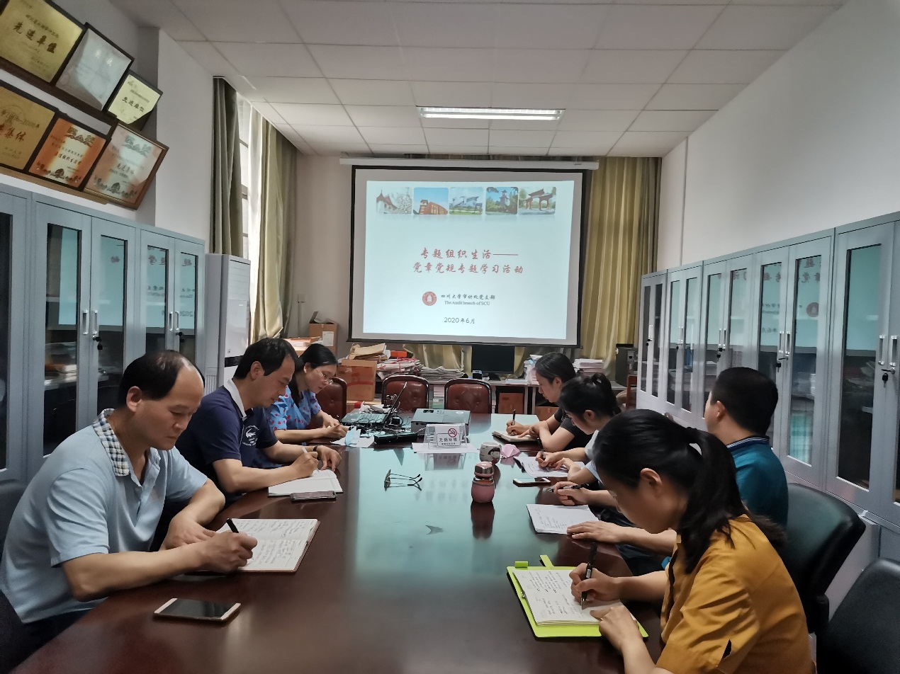 2020年6月19日上午,审计处党支部按照本学期工作计划,开展党章党规专题学习,进一步树牢审计党员的规矩意识。